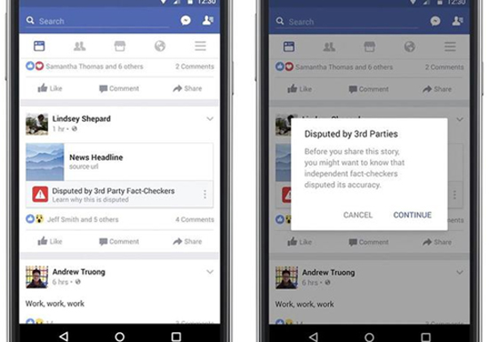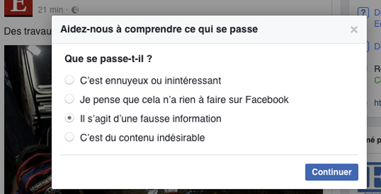 Les utilisateurs de Facebook peuvent signaler des publications à des organisations de « fact-checkers » qui ont toutes au préalable adhéré au « code de principes international de fact checking » du Poynter Institute for Media Studies, émis par l’International Fact-Checking Network (IFCN). En fonction de leur propre jugement, ces organisations marquent certaines informations comme fausse information (fake news) pour avertir les autres utilisateurs du réseau social qui les consulteront.