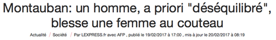 L’article précisait cependant : « Une fois menotté, le suspect, originaire de Saint-Denis de la Réunion, a alors crié “Allah Akbar [Dieu est le plus grand en arabe]” et “On va tous vous tuer”, a indiqué le parquet de Montauban. “C’est l’acte d’un déséquilibré”, avait rapidement déclaré une source proche de l’enquête, écartant l’hypothèse terroriste. »