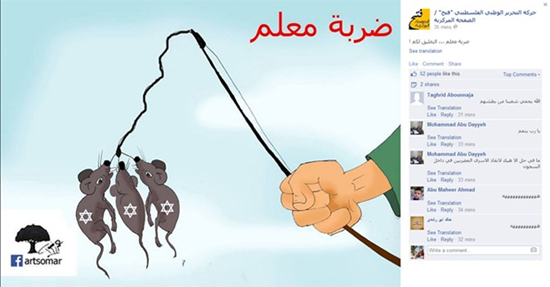 Un dessin antisémite sur la page Facebook du Fatah comparant trois Israéliens kidnappés et assassinés à des rats, marqués du sceau juif de l’étoile de David.
