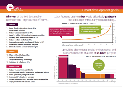 Un panel expert, incluzând doi laureați Nobel, a identificat 19 obiective țintă (vezi grafic) care reprezintă cea mai bună valoare – dolari câștigați pentru fiecare 1 dolar investit – în perioada 2016-2030.