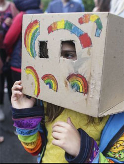 Cu adevărat șocant este că unii dintre copii țineau în mână pancarte cu diferite mesaje pe care, foarte probabil, nu le înțelegeau. Un alt copil avea pe cap o cutie pentru a se proteja de ploaie, cutie vopsită în deja celebrele culori.