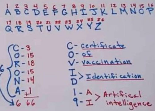 În ceea ce priveşte corona și covid-19, analizate din punct de vedere numerologic, acestea relevă niște legături cel puțin bizare, pe care, ca fiinţe atente la simbolistică, nu le mai putem interpreta drept coincidențe. În aceste nume, alese aparent după criterii ştiinţifice de capii lumii medicale, sunt prezente în mod criptic numărul 666, certificatele de vaccinare şi inteligenţa artificială!