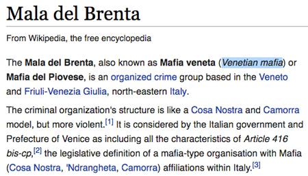 The MAFIA has reigned supreme wherever it chose to set up shop in America and beyond. The much more recent Sicilian mafia was actually a latecomer to the terrorism game and was modeled after the original MAFIA families of Northern Italy that were formed to terrorize their enemies in order for the powerful banking families to maintain their ascendancy. The Venetian Mafia – the Mala del Brenta – was in fact one of the first to highly organize, although their Wikipedia page conveniently does not leave that impression.