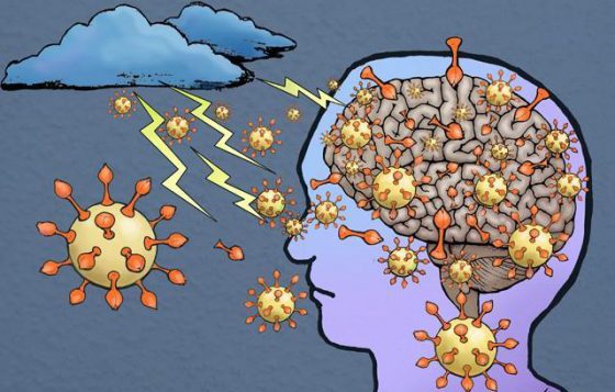 De asemenea, CE din creier exprimă puternic ACE2. Proteina Spike are efecte toxice similare asupra CE din creier, inducând simptome neurologice (ceaţă cerebrală, declin cognitiv).