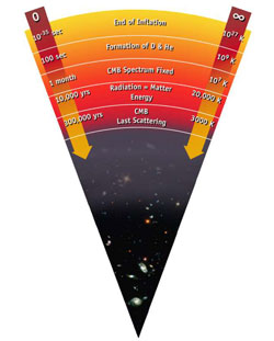 După 10.000 de ani, temperatura a scăzut destul de mult pentru ca materia să înceapă să predomine în Univers – radiaţia fotonică pierdea energia acumulată în timpul expansiunii (lungimea de undă creştea) şi densitatea masei particulelor depăşea densitatea masei fotonilor. După 300.000 de ani, temperatura a scăzut la 3.000 de grade Kelvin, materia şi radiaţia s-au desprins şi au început să se formeze atomi stabili. Echilibrul termic dintre materie şi radiaţie a încetat, iar în urma separării, a rezultat un reziduu al radiaţiei de bază, pe care oamenii de ştiinţă l-au descoperit cu 15 miliarde de ani mai târziu, cu ajutorul satelitului COBE. Universul a devenit transparent pentru prima dată de la formarea sa.