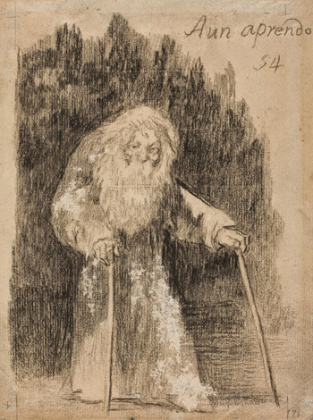 Cea mai bună ilustrare a acestei idei ne-o oferă Goya, care, într-o litografie târzie, desenează un bătrân neputincios și emaciat, cu o privire pătrunzătoare însă. Se apropie încet, sprijinindu-se pe două bastoane. Titlul lucrării, în colțul de sus, din dreapta, este „Învăț mereu”. Acest portret, al unui bătrân de 88 de ani, rezumă în mod admirabil principala sarcină a fiecăruia – a trăi o viață cât mai utilă, pentru a fi gata să pășești în veșnicie.