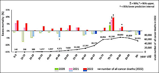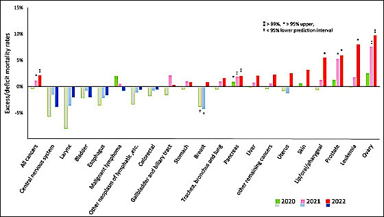 În ceea ce privește cancerele, cercetătorii nu au constatat o mortalitate excesivă semnificativă în 2020, ci o creștere cu 1,1% în 2021, după lansarea primei și celei de-a doua doze de vaccin, și o creștere cu 2,1% în 2022, după ce două treimi din populație primise o a treia doză de vaccin ARNm anti-covid-19.