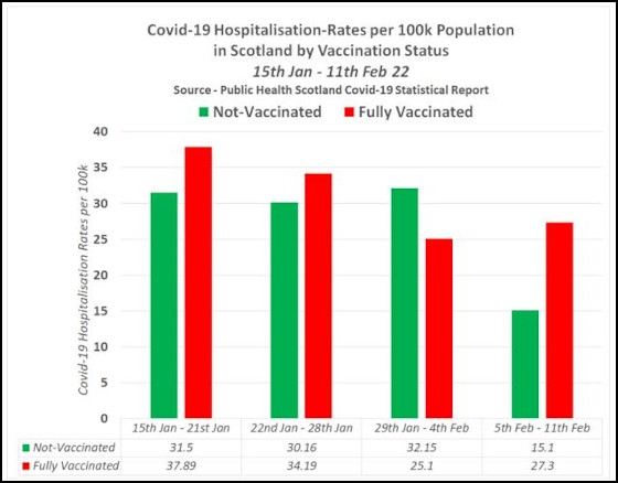 Graficele de mai sus au fost create pe baza cifrelor publicate de Public Health Scotland în „Covid-19 & Winter Statistical Report”, anunțate la 16 februarie 2022, și arată că ratele de infectare, spitalizare și deces la 100.000 de persoane cu covid-19 au fost în mod constant mai mari în rândul populației complet vaccinate.