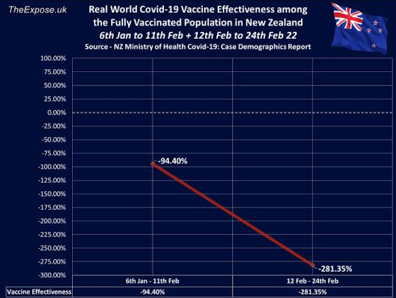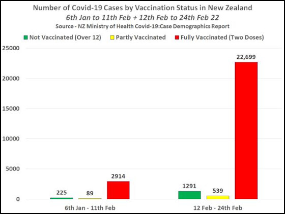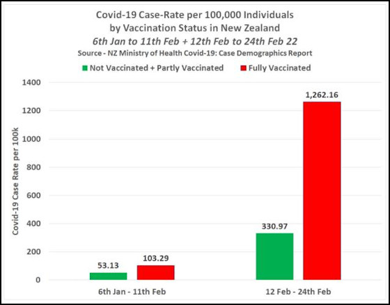 Următorul grafic arată numărul real de cazuri de covid-19 în funcție de statutul de vaccinare, între 6 ianuarie și 11 februarie și între 12 februarie și 24 februarie, în Noua Zeelandă. Datele au fost extrase dintr-un document oficial al Ministerului Sănătății din Noua Zeelandă.