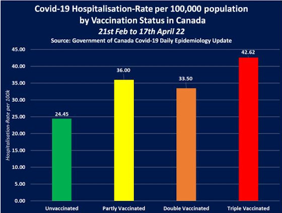 Datele oficiale ale Guvernului Canadei arată că populația vaccinată, în ansamblul ei, a reprezentat 4 din 5 cazuri, spitalizări și decese de covid-19 din 21 februarie 2022, până la 17 aprilie.