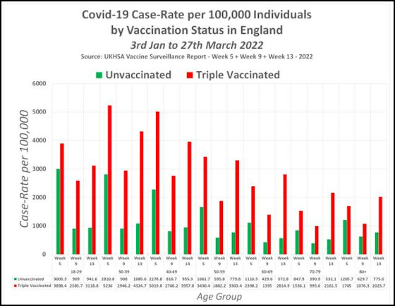 Cifrele arată că ratele de cazuri între săptămâna 5 și săptămâna 13 din 2022 au fost cele mai ridicate în rândul celor triplu vaccinați din toate grupele de vârstă din Anglia. Și nu doar cu puțin, iar diferența dintre cei nevaccinați și cei triplu vaccinați s-a înrăutățit de la o lună la alta.