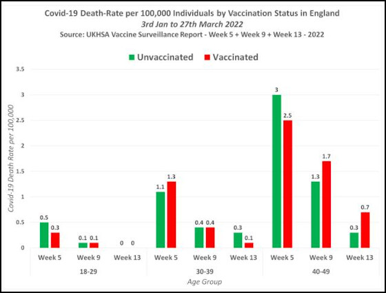 Singura altă grupă de vârstă care a întrerupt tendința a fost cea a persoanelor cu vârste cuprinse între 30 și 39 de ani, care a revenit la o rată de mortalitate ușor mai mare în rândul celor nevaccinați în săptămâna 13. Dar, în afară de aceasta, toate celelalte grupe de vârstă au suferit o rată de deces mai mare în rândul celor dublu vaccinați de la începutul anului.