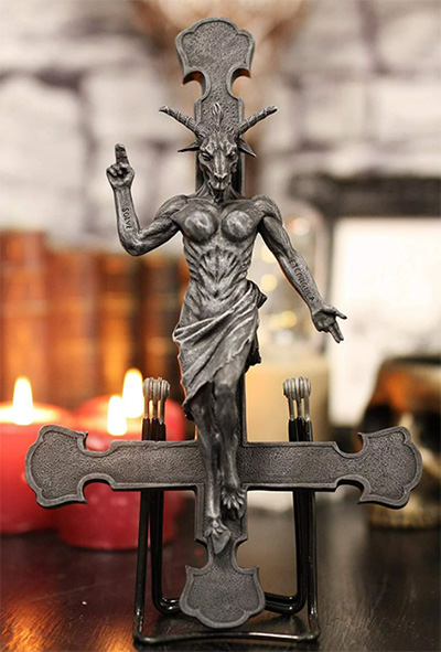 Acest decor de perete cu cruce inversată îl prezintă pe Baphomet ridiculizând crucificarea lui Hristos. Apropo, Walmart are la vânzare acest articol.