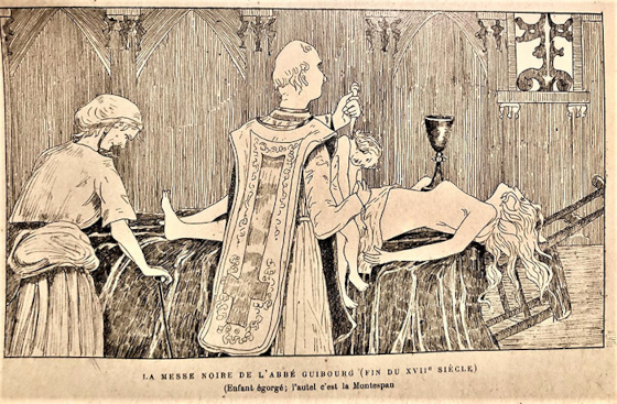 O reprezentare a unei Liturghii Negre conduse de Abatele Étienne Guibourg în secolul al XVII-lea. Deasupra „altarului viu” (o femeie dezbrăcată), Guibourg ține în brațe un copil sacrificat prin tăierea gâtului. Pe veșmintele lui se află o cruce gigantică inversată. Aceasta este adevărata semnificație a crucii inversate.