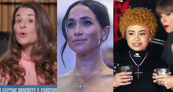 De la stânga la dreapta: Melinda Gates (în timp ce promova vaccinurile anti-covid), Megan Markle (într-o călătorie oficială a familiei regale) și Ice Spice (la cel mai urmărit Super Bowl din toate timpurile) purtau la gât cruci inversate.