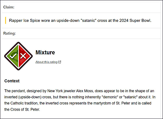 „Verificatorii de fapte” de la Snopes spun că nu există nimic satanic în crucea inversată. Ei merg chiar până la a insinua că Ice Spice a purtat-o pentru a onora martiriul Sfântului Petru. Știm cu toții că aceasta nu este adevărat, și totuși acestea sunt „faptele”.