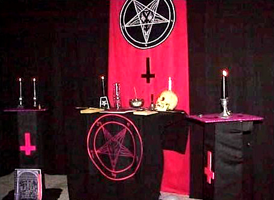 Ritualurile satanice au loc pe altare împodobite cu cruci inversate și cu sigiliul Bisericii Satanei (o pentagramă inversată în interiorul căreia se află Capra lui Mendes).