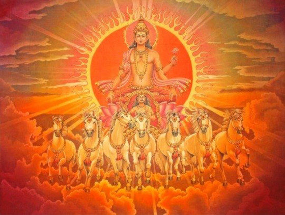 SURYA ‒ Zeul Soarelui Surya este venerat în hinduism și este reprezentat călătorind într-un car tras de șapte cai. Surya este descris ca un bărbat frumos și strălucitor, cu trei ochi și patru brațe, ținând flori de lotus și alte simboluri sacre. Templele dedicate lui Surya, cum ar fi Konark în India, sunt exemple ale importanței sale în religia hindusă.