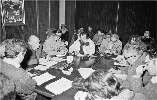 Alin Teodorescu, alături de membrii GDS, ascultă indicațiile lui Silviu Brucan la prima întrunire a grupului