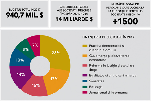 Într-un interviu din 1995, George Soros a oferit două motive pentru care finanțează masiv fundațiile din estul Europei: „Cred în principiile unei societăți deschise și îmi permit financiar să fac asta. Admit că nu sunt un om obsedat de detaliile organizării. Dar îmi rezerv dreptul de a formula strategia organizației“. Întrebat ce anume fac organizațiile sale, Soros a răspuns: „E imposibil de spus. În fiecare țară am identificat un grup de oameni, unele personalități, altele mai puțin cunoscute, care îmi împărtășesc credința într-o societate deschisă, iar apoi le-am dat sarcina să stabilească prioritățile“.