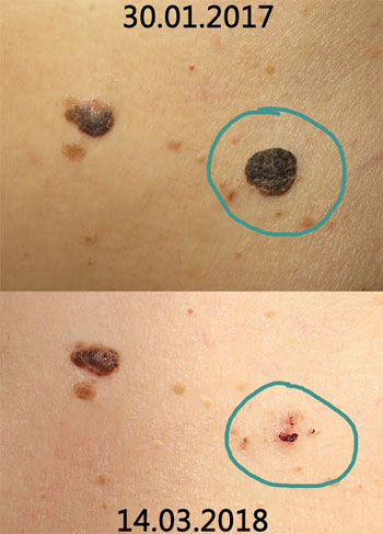 Pentru mai multă claritate, am făcut o imagine cu BEFORE şi AFTER, ca să se vadă şi mai clar cum era şi cum arată acum zona respectivă. Şi observaţi, vă rog, că şi al doilea melanom şi-a modificat forma, semn că vrea şi el conversaţie ca să plece. El fiind mai mic, e ceva mai vascularizat, deci am aşa o intuiţie care-mi spune că el va fi resorbit, nu se va usca pentru a se desprinde.