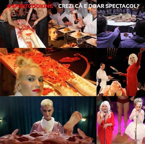 Nume grele iau parte la dineurile absolut sinistre organizate de Marina Abramovic, o pseudo-artistă a cărei artă se poate rezuma prin două cuvinte: grotesc și satanic. Katy Perry, Gwen Stefani, Pamela Anderson, Lady Gaga, Beyonce, Will Farell, iau parte în mod constant la aceste așa-numite ședințe de „spirit cooking”. Aceleași nume grele din industria de muzică și de film sunt cele care promovează obsesiv și vomitiv simbolurile aşa-zişilor „iluminaţi”: