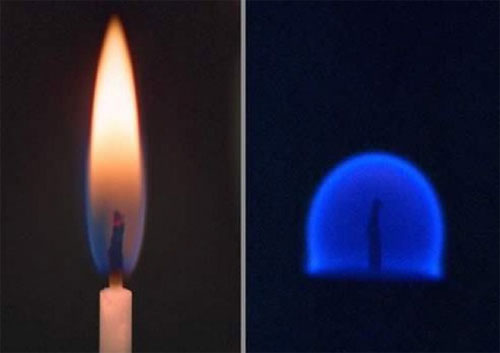 În imaginea din stânga apare o lumânare care arde pe Pământ, iar în cea din dreapta este o lumânare care arde în lipsa gravitaţiei, la staţia spaţială Mir.