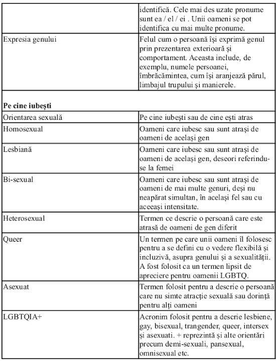 Creșă/Grădiniță: Elevii vor învăța despre identitățile lor și ale celorlalți. Vor explora conceptul de familie, jucării de gen și stereotipuri de îmbrăcăminte, culorile și semnificația lor, steaguri, parteneriat, susținere și identitate.