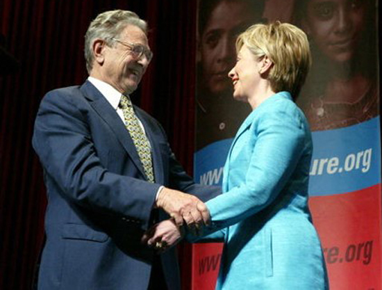 Washington, 3 iunie 2004: Filantropul George Soros și senatoarea americană Hillary Clinton, după ce ea l-a prezentat în cadrul Conferinței Take Back America. Scopul conferinței a fost să unească grupuri de lucru progresiste, precum și să le instruiască pentru organizarea de campanii în 2004 și mai târziu.