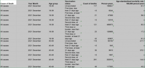 La 16 mai 2022, Oficiul Național de Statistică (ONS) a publicat un set de date care conține detalii privind „decesele în funcție de statutul de vaccinare în Anglia”, între 1 ianuarie 2021 și 31 martie 2022.