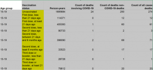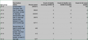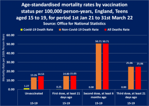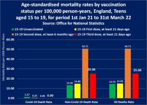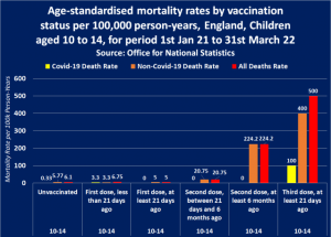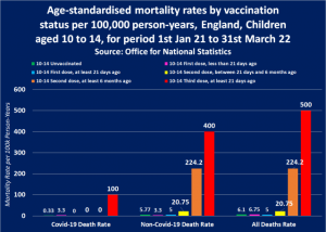 Datele ONS arată că, între 1 ianuarie 2021 și 31 martie 2022, copiii triplu vaccinați cu vârste cuprinse între 10 și 14 ani au avut, din punct de vedere statistic, un risc de 303 ori mai mare de a muri din cauza covid-19 decât copiii nevaccinați, un risc de 69 de ori mai mare de a muri din orice altă cauză decât covid-19 decât copiii nevaccinați și un risc de 82 de ori mai mare de a muri din toate cauzele decât copiii nevaccinați.