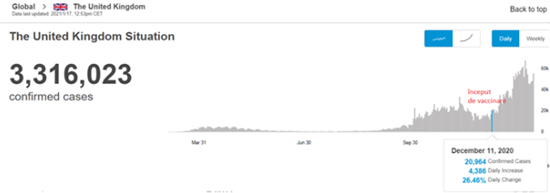 În Marea Britanie, campania de vaccinare a început pe 8 decembrie, cu vaccinul dezvoltat de Pfizer/BioNTech. De la acea dată, numărul de contaminări zilnice a explodat – 20.964 de cazuri pe 11 decembrie, 55.761 pe 16 ianuarie 2021.