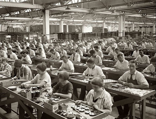 Pentru ca miile de oameni să poată să muncească într-un asemenea mediu, ei trebuie condiţionaţi de la o vârstă foarte fragedă pentru a se putea obişnui să trăiască în funcţie de un program disciplinat. În industrie şi în alte zone de muncă din afara fabricilor acelaşi principiu de organizare se aplică cu intensitate diferită. Sistemul şcolilor publice condiţionează elevii să îşi conformeze dorinţele lor în funcţie de un program strict prin impunerea de pedepse pentru cei care nu vin la şcoală la timp, care întârzie la ore, sau nu îşi fac temele în timpul stabilit de profesor. Această situaţie ne pregăteşte pentru o viaţă de fabrică sau de birou unde „timpul înseamnă bani”. Pentru a maximiza nivelul în care elevii pot fi exploataţi când intră în câmpul muncii, ei trebuie să fie condiţionaţi să li se facă frică sau să se simtă vinovaţi dacă nu ajung la şcoală la timp şi să se supună unui program creat de către cei care au autoritate asupra lor.