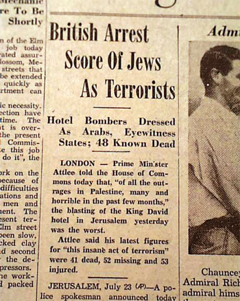 Operațiunile teroriste evreiești împotriva britanicilor au continuat fără pic de respiro până spre sfârșitul Mandatului în mai 1948. Înainte de 1944, terorismul evreiesc fusese îndreptat exclusiv împotriva civililor palestinieni, mai ales între 1937-1939. În această perioadă, terorismul evreiesc a introdus pentru prima dată în Orientul Mijlociu tactica diabolică a minelor cu acțiune întârziată cu detonare electrică, ascunse în containere de kerosen, cutii de lapte și coșuri cu fructe în stațiile de autobuz arabe, în piețe și în cafenele. Începând cu 1944, aceste tactici, cu variații mai sofisticate și șocante, au fost folosite împotriva țintelor britanice de către grupările Irgun și Stern. (Ben Eliezer, Israeli Militarism)