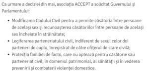 * Poziția noastră ca organizație civică este radicală și fidelă valorilor noastre, așa cum a fost mereu: nicio alterare a legislației căsătoriei și familiei nu este acceptabilă.