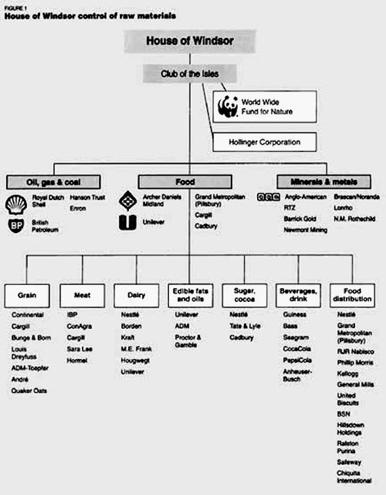 Figura 1 de mai sus ilustrează situația. În partea de sus se află Casa de Windsor și Club of Isles („Clubul insulelor”). Imediat sub ele se află principalele instrumente de control ale familiei Rothschild – Fondul Mondial pentru Natură – ce a fost condus de Prințul Phillip – care conduce lumea în domeniul conflictelor etnice și al terorismului.