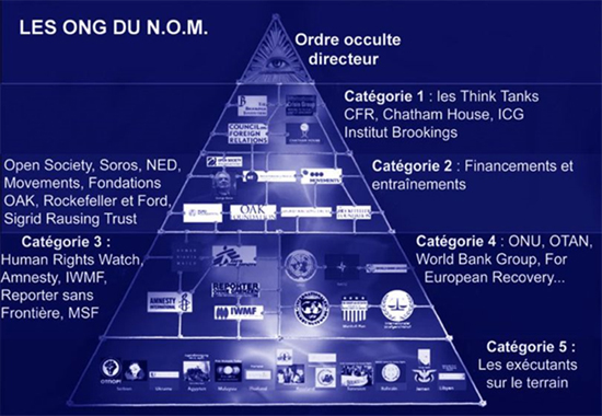 La catégorie 1 constitue le noyau d’une puissance politique transnationale, c’est le cœur d’un système d’influence mondial des élites de l’argent et du pouvoir. Leurs orientations doivent être directement appliquées par les hommes politiques élus des « dites démocraties ». S’ils n’obtempèrent pas, ils s’exposent à une révolution colorée qui sera mise en œuvre par les ONG de la catégorie 2 en charge de faire appliquer les directives aux plus récalcitrants. La catégorie 5 s’occupera ensuite du coup de feu sur le terrain…