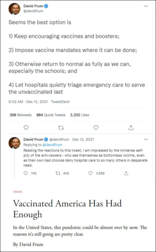 Un susținător vocal al ideii de triere a asistenței de urgență pentru a fi defavorizați cei nevaccinați a fost David Frum, redactor principal la ziarul Atlantic, cunoscut mai ales pentru sprijinul deschis pentru invazia Irakului.