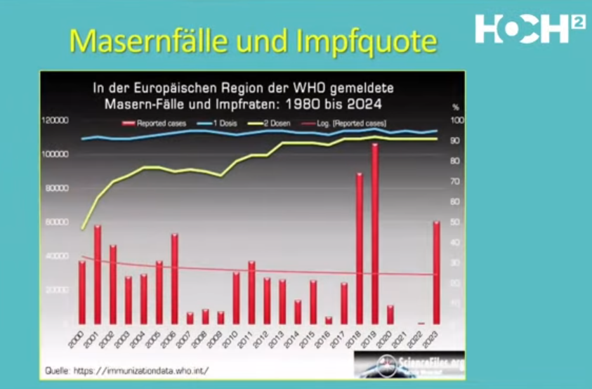 Vedem aceasta și atunci când analizăm numărul de cazuri de rujeolă în Europa (afișaj min. 9:59): se vede prima vaccinare în linia albastră de sus și a doua vaccinare în linia verde neon. A doua vaccinare a devenit mult mai frecventă de-a lungul anilor. Și totuși, din numărul cazurilor de rujeolă se poate observa că, după un declin inițial începând cu anul 2000, au apărut din nou epidemii repetate în unele țări în ultimii ani, în ciuda acestui nivel ridicat de vaccinare. Aceasta demonstrează că vaccinarea nu protejează turmele, deoarece imunizarea prin vaccinare nu produce imunitate.