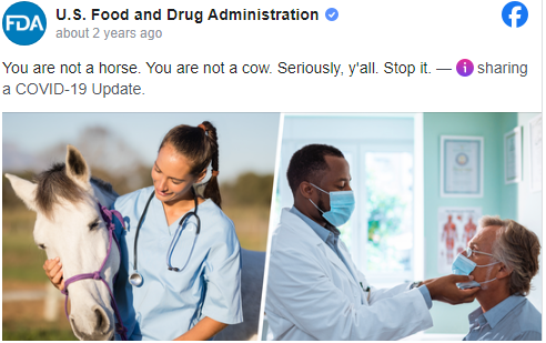 Potrivit procesului, FDA a publicat o actualizare informală pentru consumatori la 18 luni de la declanșarea pandemiei, descurajând utilizarea ivermectinei pentru prevenirea și tratarea covid-19. Aceasta a publicat apoi un document privind covid-19 și ivermectina destinat animalelor și a făcut patru postări online ‒ una pe site-ul său și trei pe rețelele de comunicare virtuală, cu o imagine a unui cal, în care se precizau următoarele: