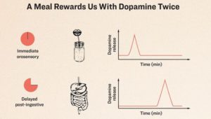 De îndată ce alimentele intră în gură, gustul este transmis rapid prin intermediul nervilor bucali către zonele cerebrale specifice responsabile de gust, provocând un răspuns suplimentar al dopaminei în creier.