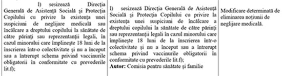 În varianta adoptată de Senat și trimisă Comisie de Sănătate a Camerei, apărea și sintagma „neglijare medicală”, alături de „încălcare a dreptului la sănătate”, dar a fost eliminată.