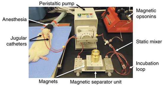 L’appareil imite la rate, dont la fonction consiste, avec d’autres organes, à purifier le sang. Il utilise des billes magnétiques nanoscopiques (moins d’un millième de millimètre) recouvertes d’une protéine sanguine humaine conçue génétiquement, appelée MBL. La protéine MBL se lie aux agents pathogènes et aux toxines, qui peuvent alors être « extraits » du sang grâce aux nanobilles magnétiques qui se comportent comme de minuscules aimants.
