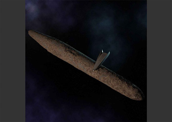 Illustration artistique d’Oumuamua et d’un vaisseau spatial en visite. Crédit : Gaia TV/Sphere Being Alliance