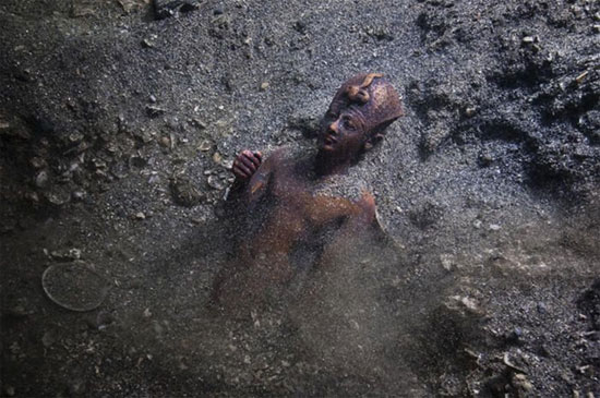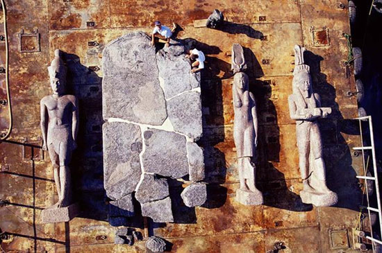 Voici le plongeur Franck Goddio qui étudie l’énorme statue sculptée à la main d’un pharaon. Cette statue mesure environ 5 mètres de haut et a été découverte près d’un grand temple sous la mer.