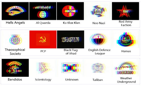 Imaginile sunt logo-urile mai multor organizaţii controversate, între care Hizbut Tahrir (steagul negru al Jihad-ului, logo-ul Hizbut Tahrir – organizaţie politică pan-islamică acuzată de răspândirea violenţei, urii şi anti-semitismului), Al Qaeda, English Defence League (mişcare de extremă dreapta acuzată că ar fi islamofobă), Hamas (mişcare de rezistenţă islamică cu aripă militară), Ku Klux Klan (grupare de extremă dreapta, care susţine supremaţia albilor, este anti-imigrare, este animată de ură), Hells Angels (club de motociclişti şi grupare de crimă organizată), Red Army Faction (RAF – grupare teroristă de stânga), Neo Nazi (The Order of the Jarls of Baelder – societate neo-păgână britanică asociată cu satanismul), scientologii (descrişi în media ca fiind o sectă controversată), talibanii (mişcare politică fundamentalistă din Afganistan), Bandidos (club de motociclişti scos în afara legii şi grupare de crimă organizată), PCP (Partido Comunista Portugues – partid important din Portugalia, de stânga, acuzat de delapidare), Weather Underground (organizaţie americană de stânga asociată cu atentate cu bombă şi manifestări de stradă violente) şi Societatea Teosofică.