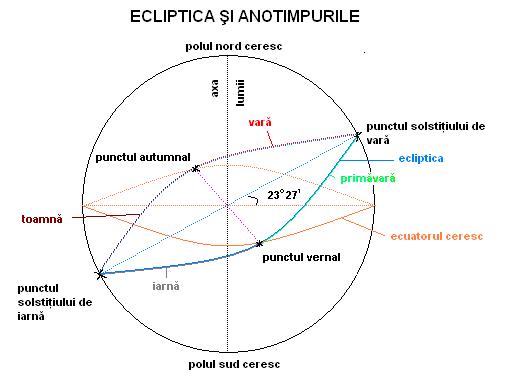 Solstiţiile şi echinocţiile reprezintă, astronomic, locurile în care cursa aparentă a Soarelui, numită ecliptică, intersectează sau se distanţează la maximum faţă de ecuatorul ceresc. Acest fapt se produce deoarece ecliptica este înclinată cu 23°27’ faţă de planul ecuatorului, ceea ce face ca Soarele: