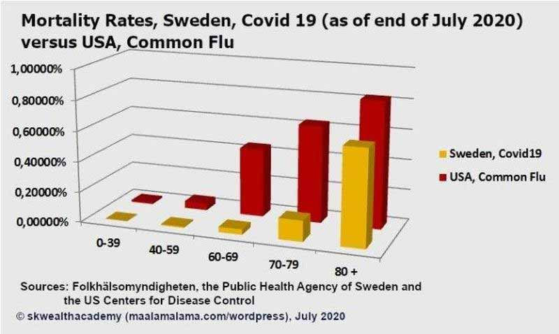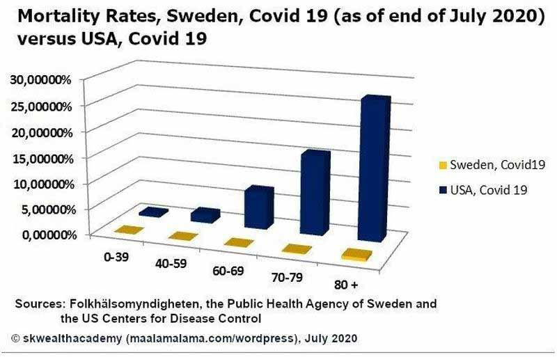 Dans le graphique ci-dessus, si l’on compare les taux de mortalité du covid-19 en Suède et aux États-Unis, en incluant toutes les données jusqu’à la fin juillet, le taux de mortalité du covid-19 aux États-Unis dans la tranche d’âge de moins de 39 ans était de 0,58 %, soit plus de 1.230 fois plus que le taux de mortalité de 0,00047 % de la Suède. En outre, dans les tranches d’âge 40-59 ans et 59-69 ans, le taux de mortalité dû au covid-19 aux États-Unis par rapport à la Suède était respectivement 215 fois et 211 fois supérieur à celui de la Suède.