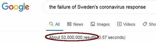 Et bien qu’une recherche sur « le succès de la réponse des Suédois au coronavirus » ait donné 63,9 millions de résultats, et que l’on puisse voir les résultats et peut-être penser que pour la première fois dans l’histoire, le moteur de recherche Google n’avait pas d’agenda dans ses résultats, un coup d’œil rapide aux titres des articles sur toute la première page dissipe rapidement cette confiance. Les premiers articles pour cette recherche étaient intitulés :