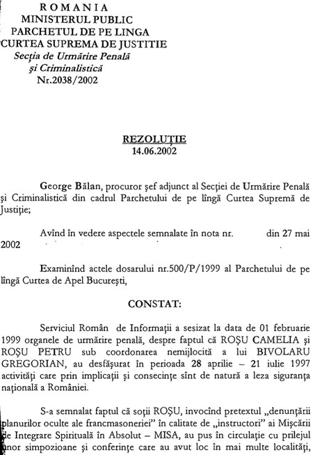 S-a semnalat faptul că soţii ROŞU, invocînd pretextul „denunţării planurilor oculte ale francmasoneriei” în calitate de „instructori” ai Mişcării de Integrare Spirituală în Absolut — MISA, au pus în circulaţie cu prilejul unor simpozioane şi conferinţe care au avut loc în mai multe localităţi, documente false care prin conţinutul şi amploarea pe care a luat-o difuzarea acestora în rîndul opiniei publice, au creat o situaţie periculoasă pentru siguranţa naţională, iar prin implicaţiile produse au fost de natură să afecteze relaţiile internaţionale ale României.
